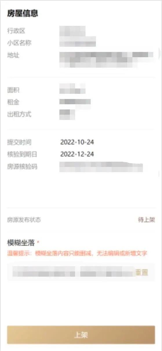 房源核验通过后,就会在“我的房源管理”出现,可以在这里点击【上架】发布房源,也可以把已上架的房源下架。为了您的信息安全,上架的时候一定要先编辑“模糊坐落”,避免把精确地址泄漏出去!