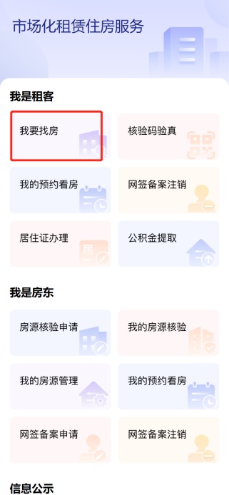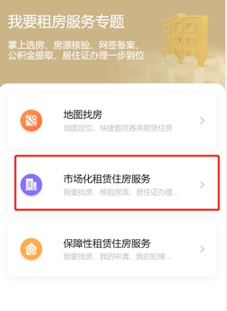在【我要租房服务专题】页面中点击【市场化租赁住房服务】进入服务,市场化租赁住房包括“我是租客、我是房东、信息公示、常见问答”等多类服务,点击对应选项即可进入相应服务。