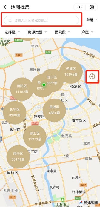 5、同时,可直接输入小区名称或地址进行搜索,或点击“定位”按钮查看附近街道房源数量。