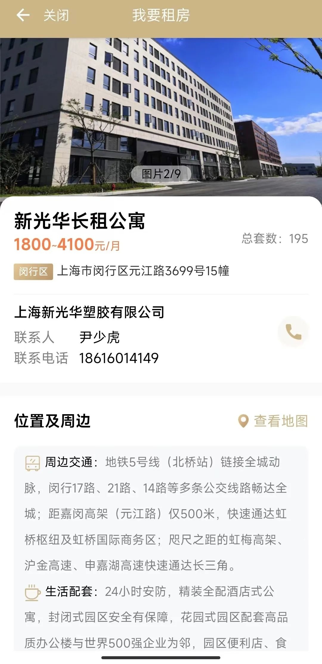 可查看房源详情。比如长租公寓,选择房源进入后,可查看位置及周边、户型等信息。