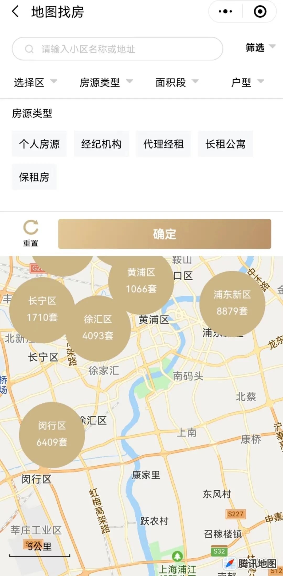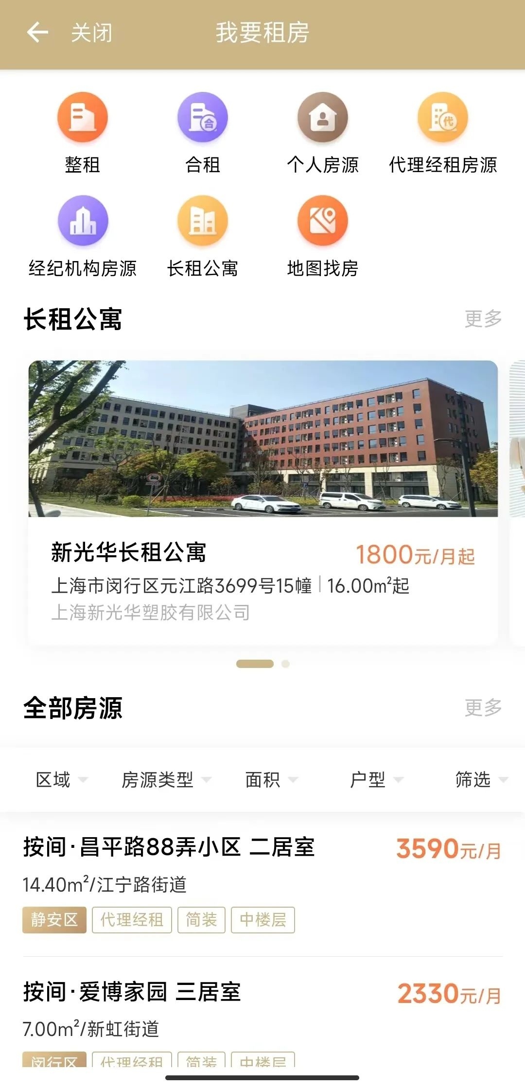 3、个人可根据实际需求按行政区、房源类型、面积段和户型筛选。