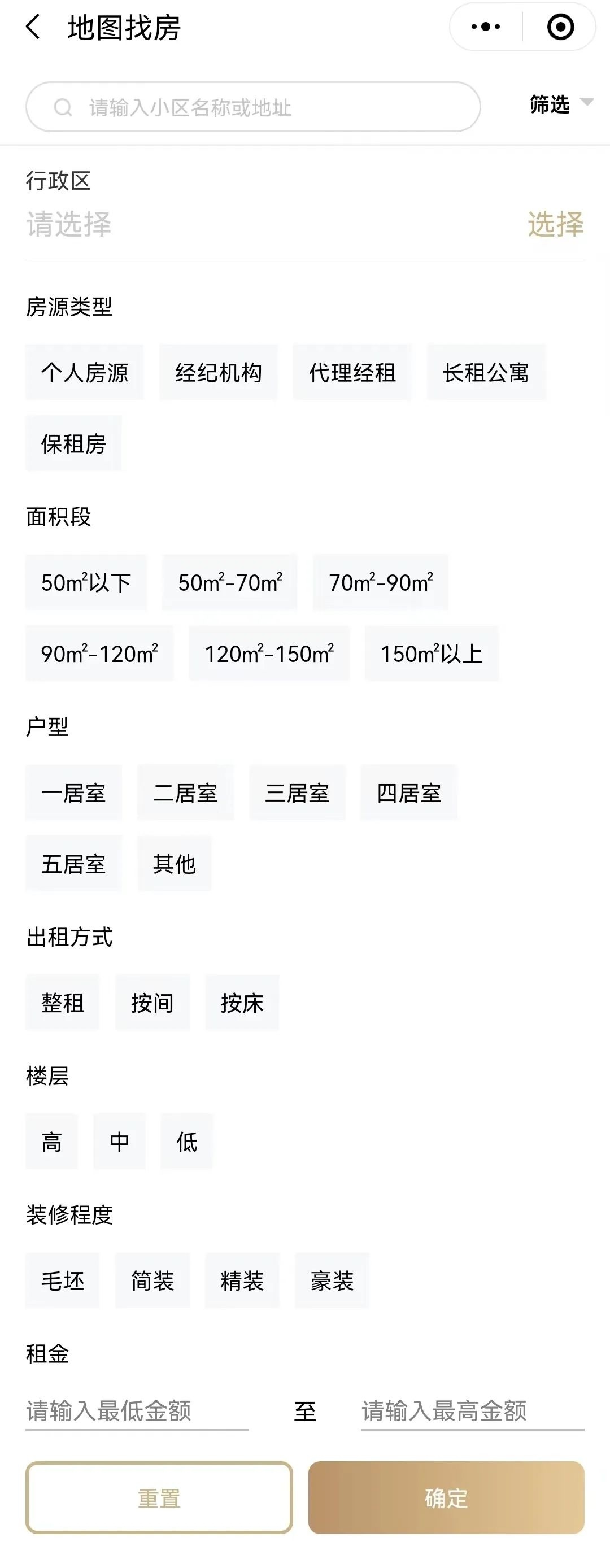 4、也可点击“筛选”按钮进入高级筛选页面,丰富更多筛选条件:出租方式、楼层、装修程度和租金,精准筛选到你最为心仪的房源。