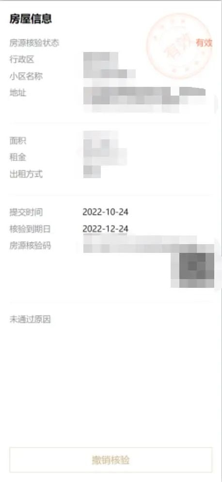 房源核验申请提交成功后,可点击【我的房源核验】查看核验的进度,如果没有通过,会告诉你不通过的原因。也可以在这里撤销有效状态的核验。