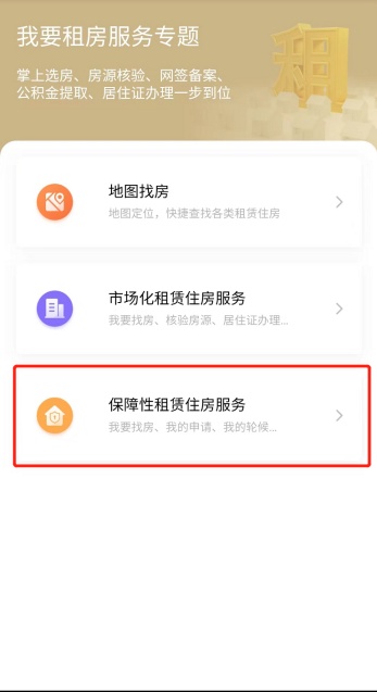 1、打开“随申办”微信小程序、“随申办”APP或支付宝小程序,首页搜索进入“我要租房”,选择“保障性租赁住房服务”。