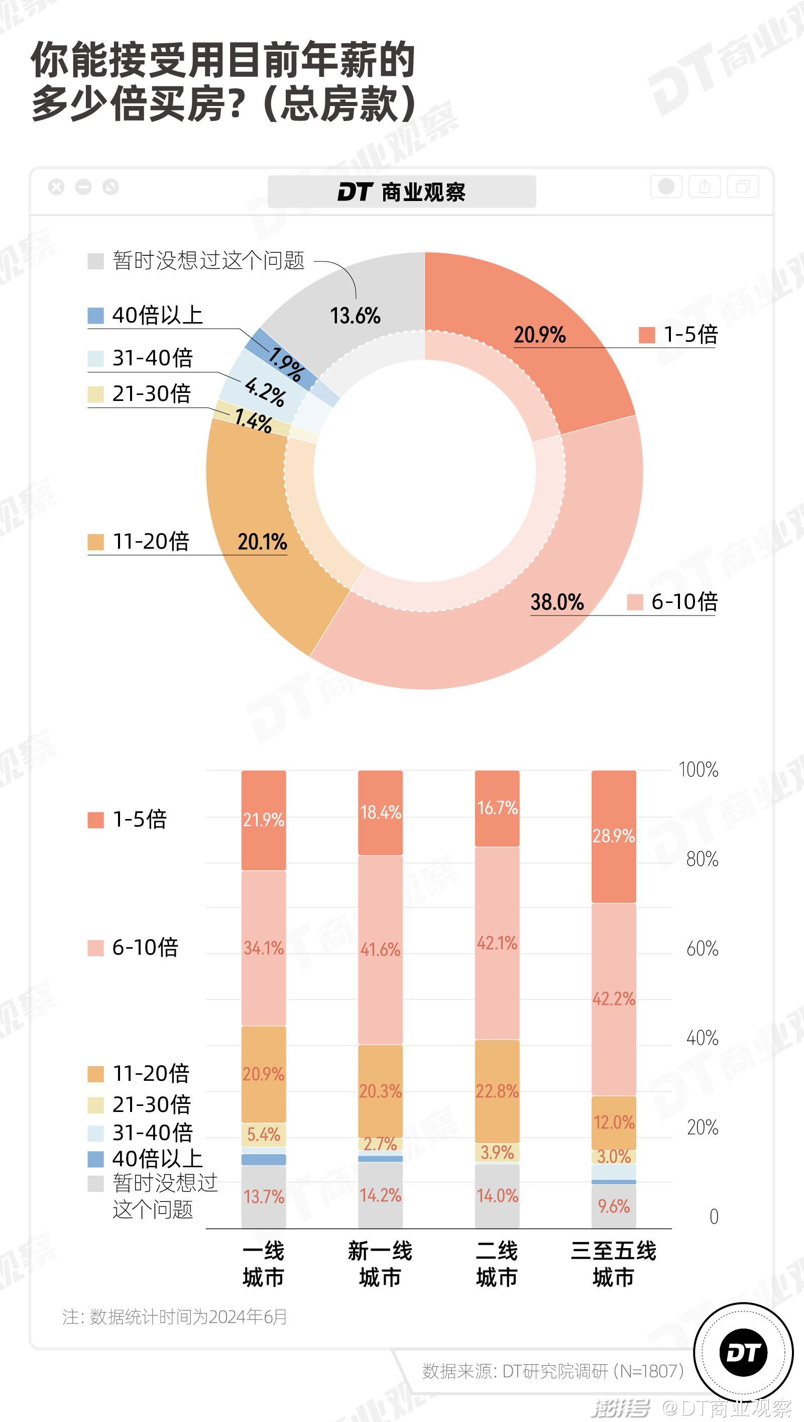 不同城市之间略有差异,在一线城市,用10倍及以下年薪买房的人占比56%(这当中不排除有人选择返乡买房或在其他城市买房),而在三至五线城市,这个比例为71.1%。