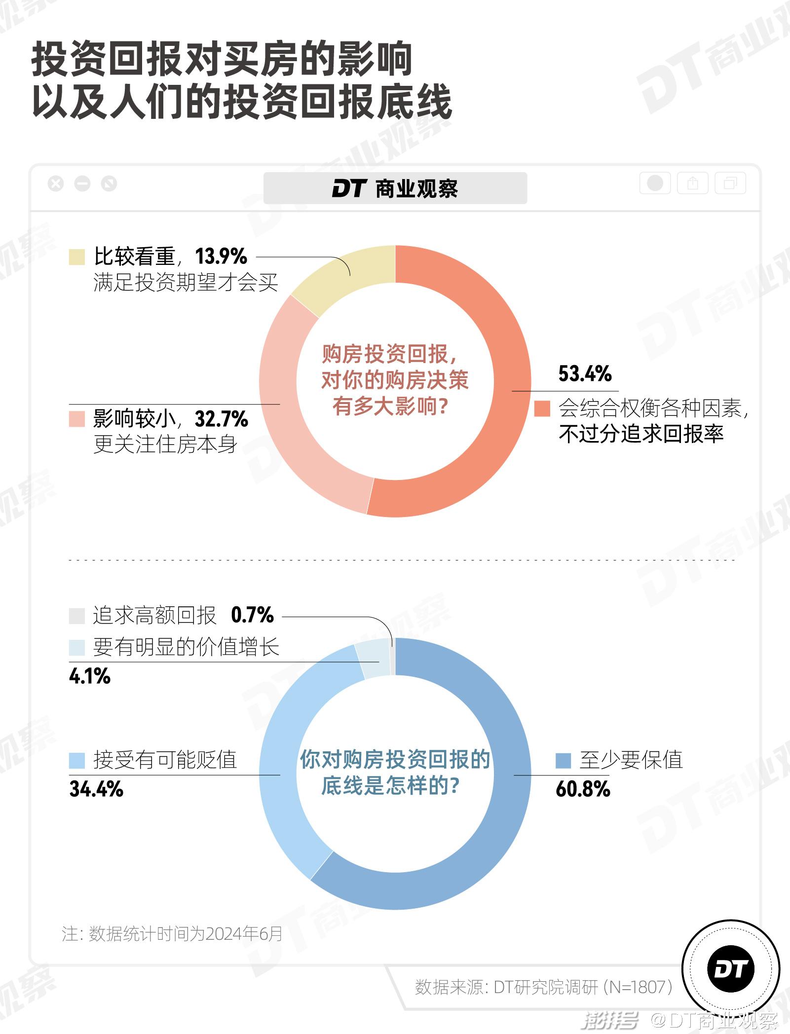 《DT商业观察》调研数据显示,60.8%的人希望房产至少要保值,34.4%的人接受房子有可能贬值,只有不到5%,还在追求明显的价值增长。