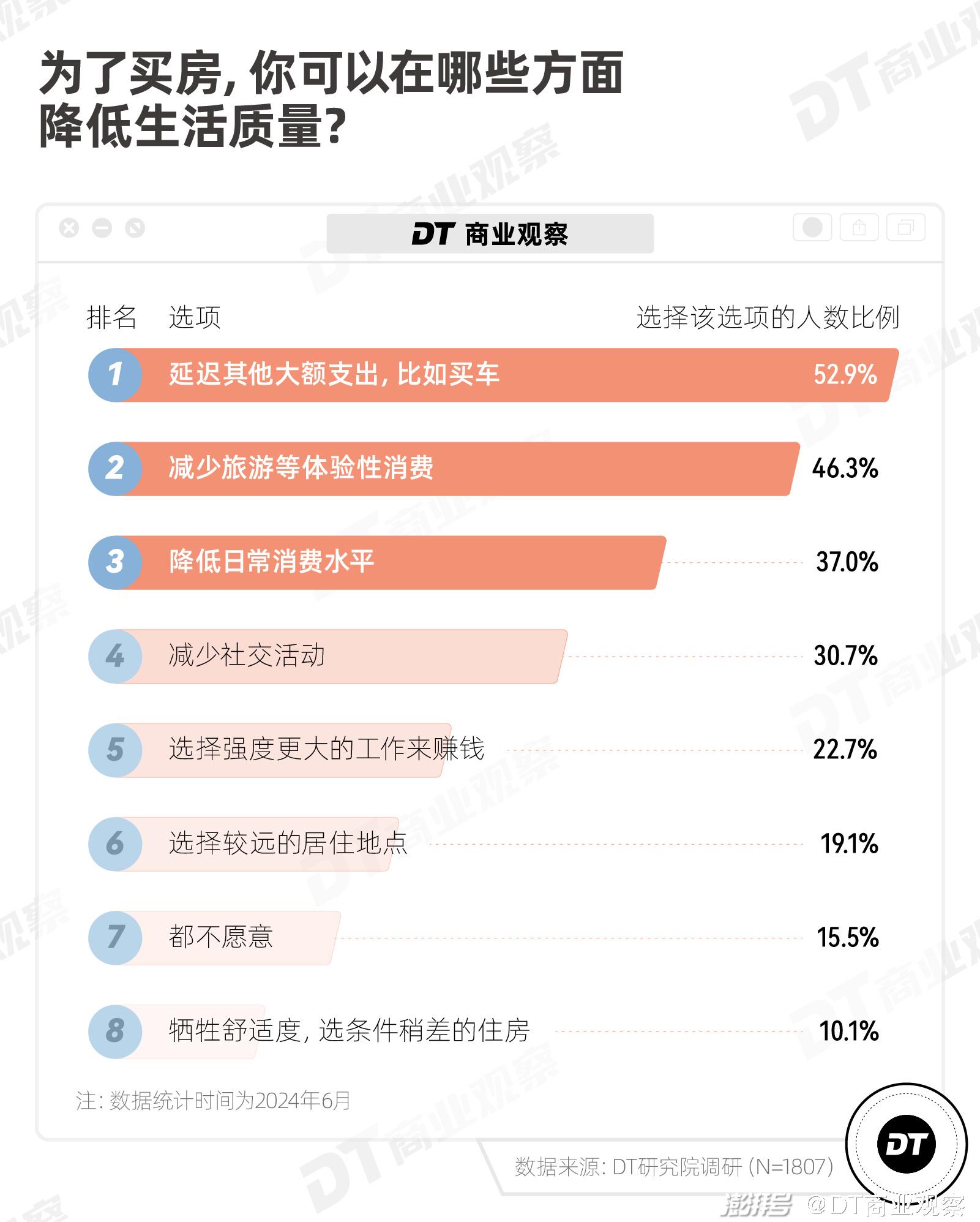 这种压力可能导致生活质量的下降,调研数据显示,84.5%的人都会为买房而牺牲生活质量。具体来看,52.9%的人将延迟买车等其他大额支出,46.3%会减少旅游等体验性消费,37%愿意降低日常消费水平。