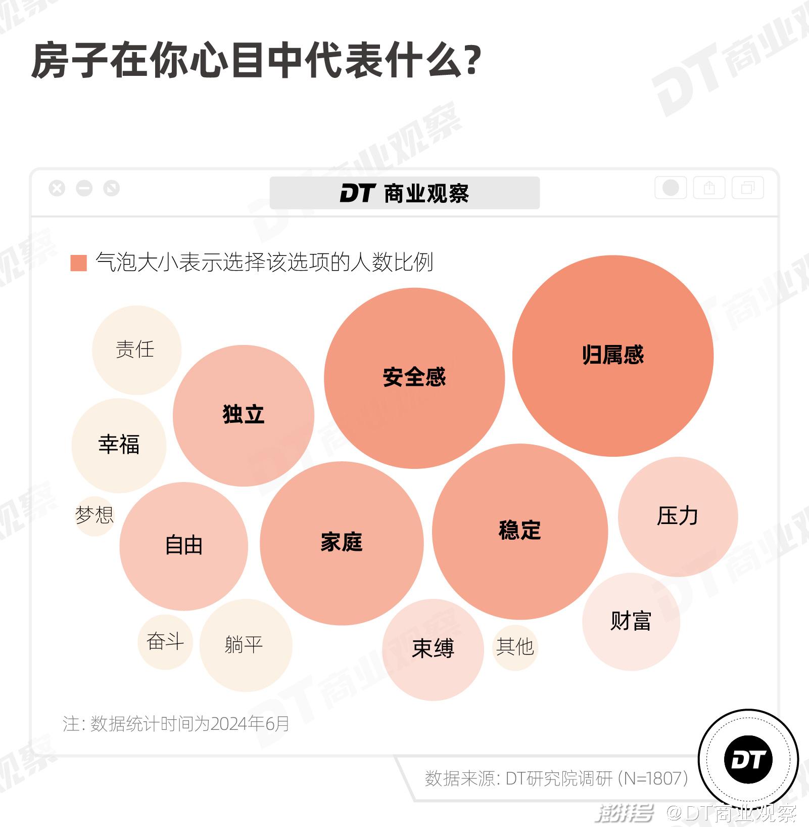 《DT商业观察》调研数据显示,51.9%的人认为房子能带来“归属感”,41.9%的人给房子赋予“安全感”的意义,超3成人认为房子代表了“稳定”和“家庭”。