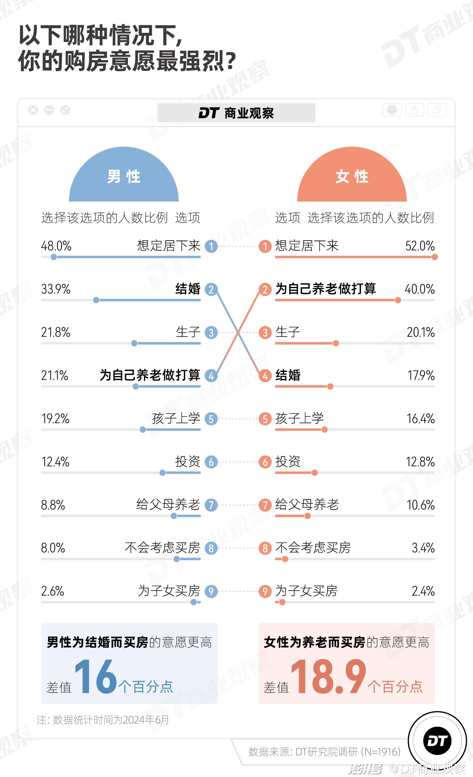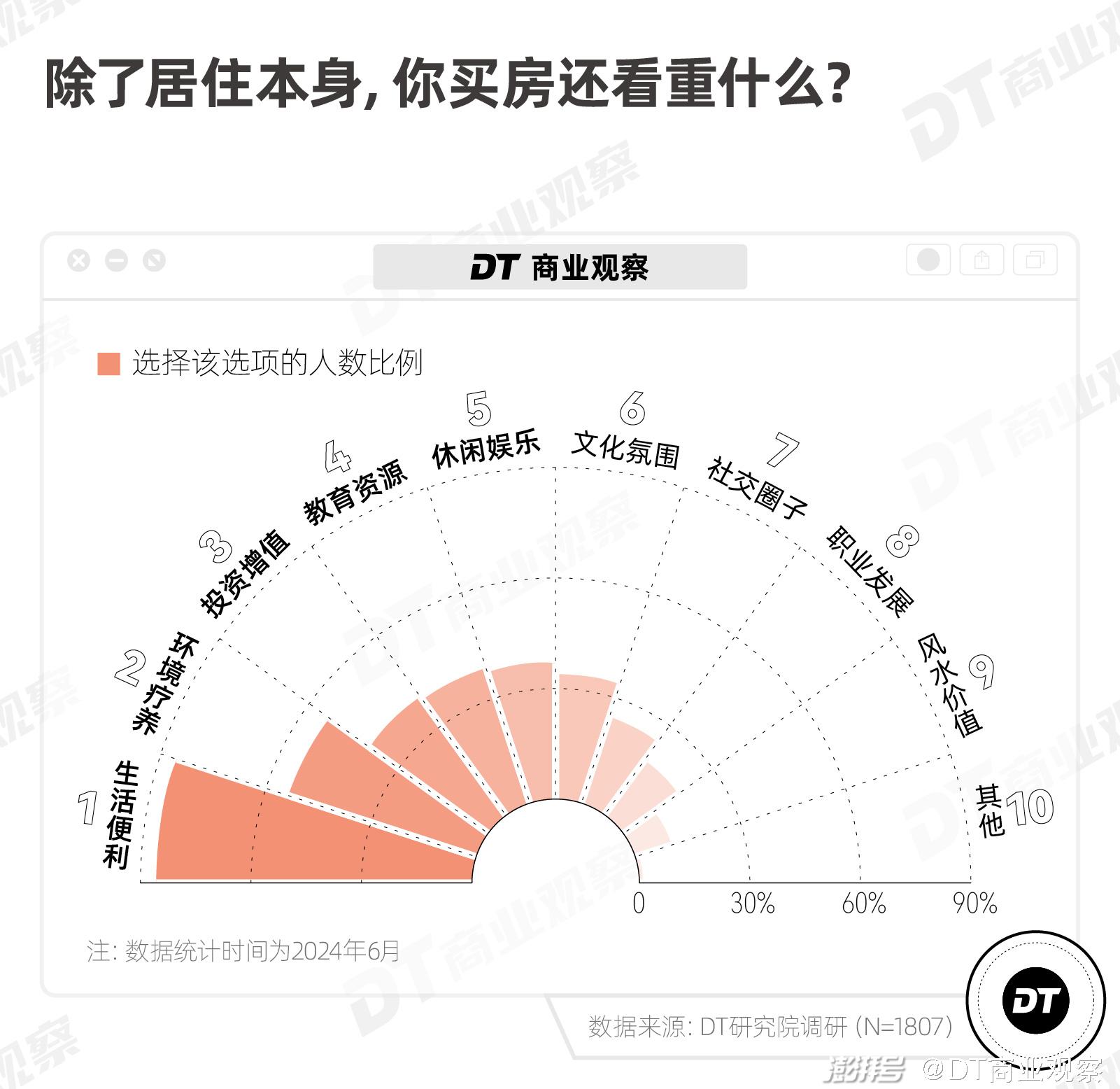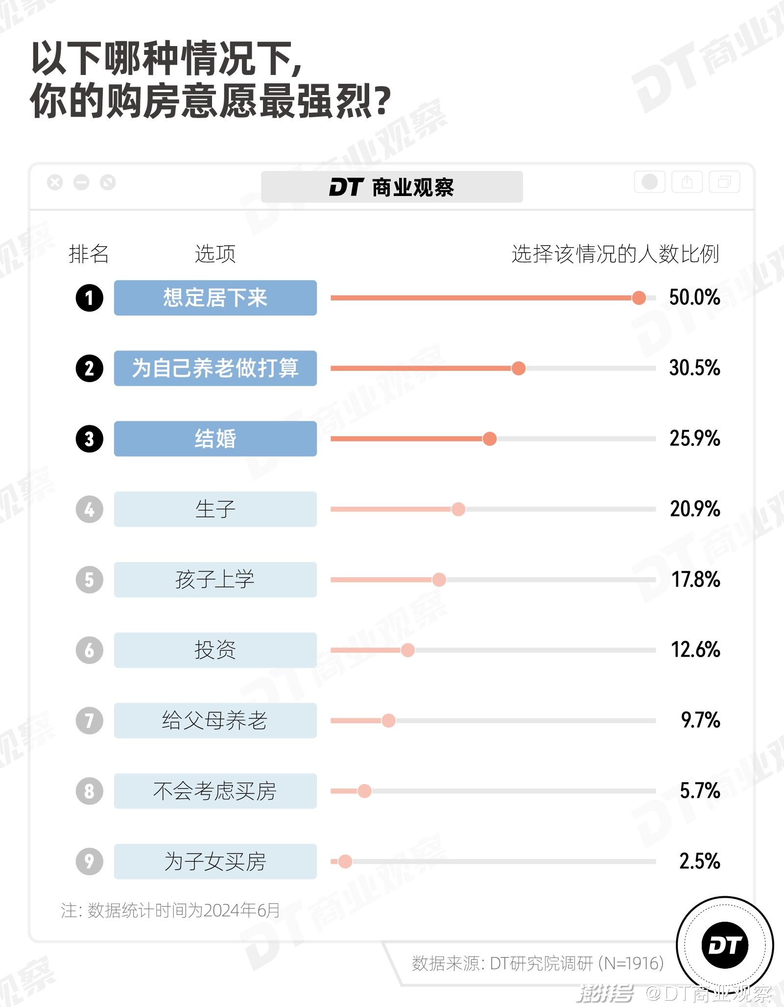 《DT商业观察》的调研数据显示,50%的人买房是为了在一个城市安定下来,30.5%的人是为自己养老做打算,接下来才是为了结婚、生子、孩子上学等。