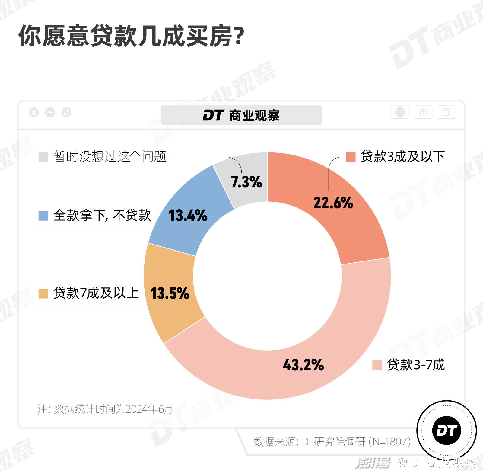 《DT商业观察》调研数据显示,只有13.4%的人选择不贷款买房,超过4成人将贷款3-7成买房,这意味着他们需要长期面对月供的压力。