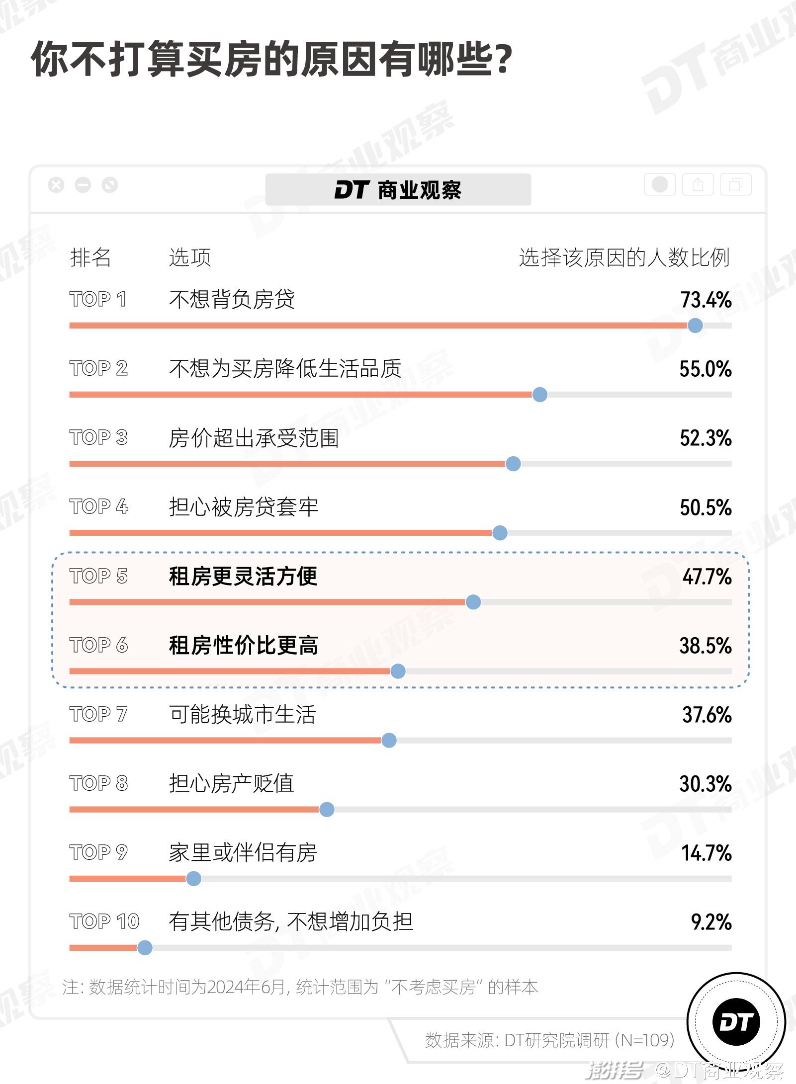 买房压力大,催生出当代人对租房的高接受度,调研数据显示,近一半人不买房,是因为租房更灵活方便;38.5%的人不买房,是因为租房的性价比更高。这一观点是有宏观数据依据的。