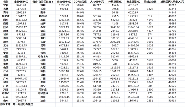 近年来,各大省会都在努力提高自身的中心度与首位度(经济总量占所在省份的比重)。第一财经记者梳理发现,有10个省份的首位度超过了30%,分别是银川、长春、西宁、哈尔滨、成都、拉萨、西安、武汉、兰州和海口,主要集中在西部地区和东北。其中银川的占比最高,达到50.6%;济南最低,只有13.3%。