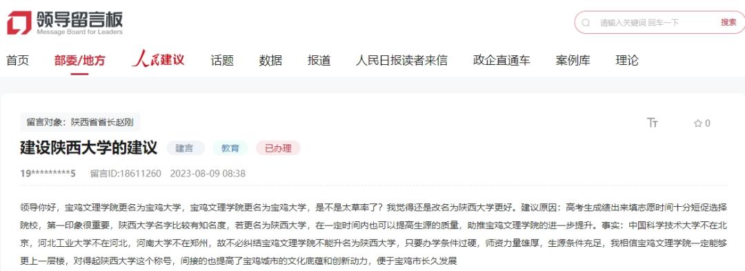 近日,有网友在人民网领导留言板提出关于“宝鸡文理学院更名为陕西大学”的建议,对此,陕西宝鸡文理学院回复称,学校校名要根据学校的人才培养目标、办学层次、类型、学科门类、教学和科研水平、规模、领导体制、所在地等,确定名实相符的学校名称。