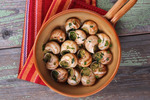 﨨法式焗蜗牛是一道地道的法国菜,是西餐特色菜之一,通常作为前菜,常见的可食用的蜗牛种类有:法国蜗牛、庭院蜗牛等。这道西餐的通常吃法是将蜗牛从壳中拉出,壳与蜗牛肉分别清洗干净,将蜗牛搭配黄油和其它自主搭配的配菜一起用黄油翻炒,入味后塞回壳中,放进烤箱中烤制,食用的时候,搭配做好的土豆泥。为了让法式焗蜗牛口感更好,法国人在吃的时候还会搭配奶油进行调味,一口下去饱满多汁,回味无穷。蜗牛肉中蕴含大量人体所需的蛋白质,也不会长胖,有降低血脂、软化血管的功效,被公认为健康肉。 【 详细>>】