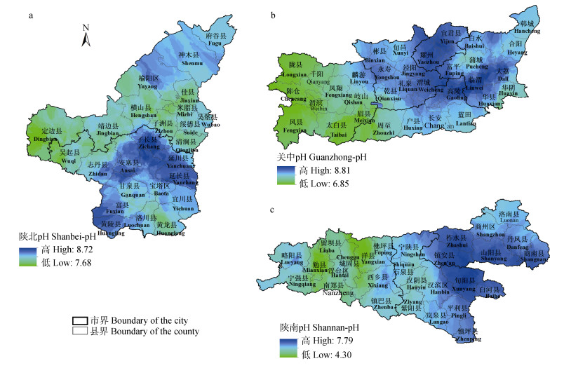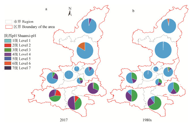 4 结论陕北耕层土壤pH呈零星斑状空间分布, 主要为弱碱性土, 与1980s相比, 土壤呈碱化趋势; 关中耕层土壤pH空间分布特征为东部高于西部, 主要为弱碱性土, 与1980s相比, 土壤呈碱化趋势; 陕南耕层土壤pH空间分布特征为东部高于西部, 中性土和弱酸性土占比最大, 与1980s相比, 土壤呈酸化趋势; 陕西省耕层土壤pH整体呈北部高于南部的空间分布特征, 弱碱性土占比最大, 与1980s相比, 土壤呈酸化趋势。建议陕北和关中地区应当有效防治土壤盐碱化, 陕南地区应当积极应对土壤酸化问题。