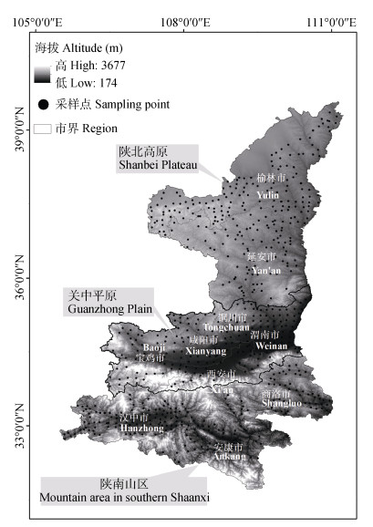 1 材料与方法 1.1 研究区概况陕西省位于我国西北部内陆腹地(105°29′~ 111°15′E, 31°42′~39°35′N), 南北长约880 km, 东西宽约160~490 km, 土地总面积占全国总面积的2.14%。陕西省自北向南划分为陕北黄土高原、关中平原和陕南秦巴山区。陕北黄土高原海拔900~1900 m, 约占全省面积的45%; 关中平原海拔460~850 m, 约占全省面积的19%; 秦岭以南为秦巴山区, 海拔多在1000~3000 m, 约占全省面积的36%[]。由于南北跨度大, 全省气候差异明显, 长城沿线以北为温带干旱半干旱气候, 陕北其余地区和关中平原为暖温带半干旱或半湿润气候, 陕南盆地为亚热带湿润气候, 山地多为暖温带湿润气候。全省年平均气温7~16 ℃, 其中陕北7~11 ℃, 关中11~13 ℃, 陕南多在14~15 ℃。陕西省是全国水资源最紧缺的省份之一, 外流河流域面积占全省面积的97.7%。全省平均降水量653 mm, 陕北水资源严重缺乏, 关中水资源短缺, 陕南水资源丰富。陕西省土地利用类型包括耕地、园地、草地、林地及建设用地等, 全省常用耕地面积为3010.52×103 hm2, 其中水田138.23×103 hm2, 水浇地971.35×103 hm2。全省共有22个土类, 49个亚类, 134个土属, 403个土种。其中, 风沙土、黄绵土、