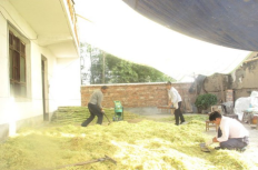 蒸熟的甜杆籽要取出来和拍碎的甜杆一起加上酒曲进行搅拌,搅拌均匀后就要进行第二次发酵。酒曲中主要原料为玉米、小麦,还有当地盛产诸多药材,比如:黄蒿、野菊花。据《本草纲目》记载,黄花蒿(Artemisia annua Linn)又叫黄蒿,是菊科蒿属,其有效成分—青蒿素在抗疟方面与传统的奎宁类抗疟药物具有不同的作用机理。野菊花味甘微苦,性平微寒无毒,有散风清热、解毒、明目功能,入肺、脾、肝、肾四经,对头痛眩晕、疔疮肿毒和眼部疾患者有特效。