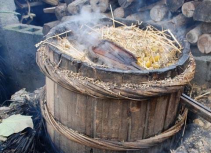 用于烧酒的木器皿叫甑子,发酵好的甜杆就盛在这里,然后装上接酒用的榴子,再在上面架上大铁锅,一边给甑子加温,一边往锅里添冷水,甑子里面的甜杆经过加温形成蒸汽,蒸汽遇冷后凝结成水滴,顺着榴子就流了出来,这就成了酒。