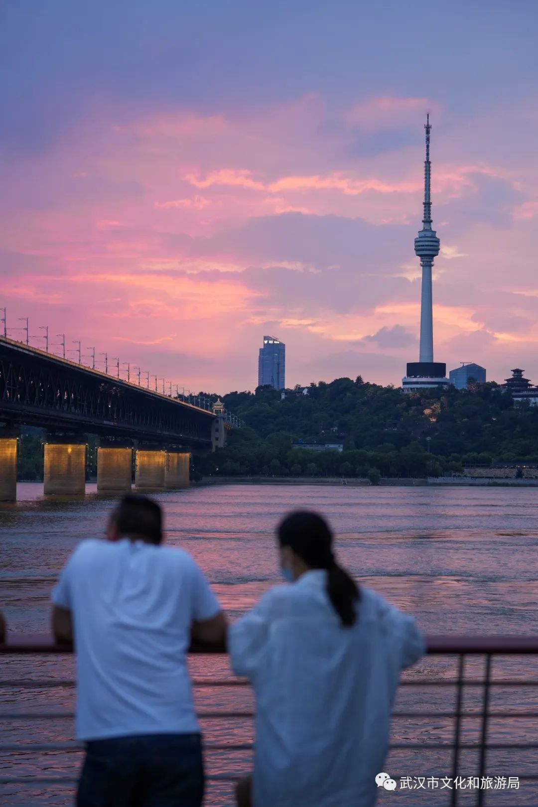 在武昌江滩看日落,长江大桥、龟山电视塔浸在赤霞橘光里;在汉口江滩,听江汉关的钟声,楼群还会对你说“武汉晚安”,超浪漫。
