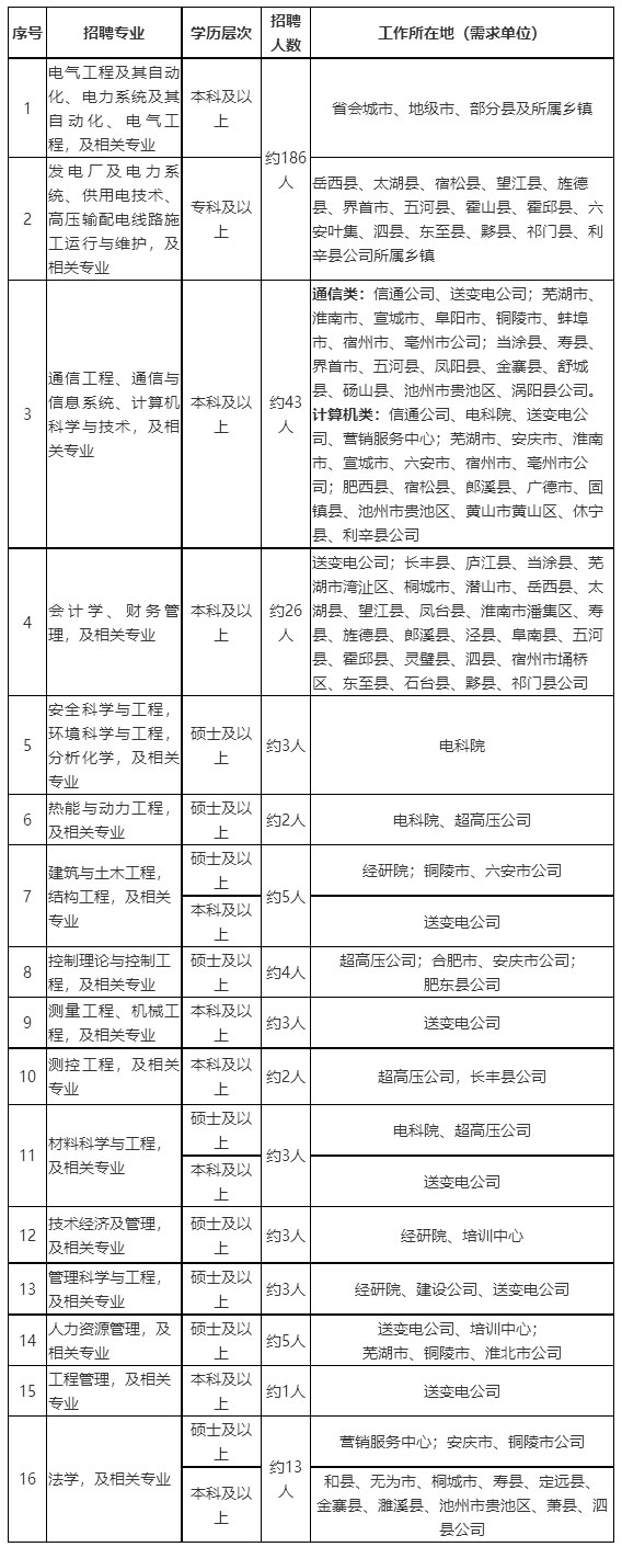 本批次招聘职位涉及公司所属市供电公司(含所属县级供电公司)和相关直属单位,主要安排在市、县供电公司生产一线岗位和直属单位专业技术、技能岗位等。需求专业信息汇总如下(均指主修专业,不包含第二学位):