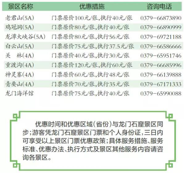 洛阳龙门石窟自2019年4月1日至2020年3月31日,对全国各省(直辖市、自治区),执行分时、分期优惠行动计划,游客以身份证为准,实行门票60元/人次优惠措施。洛阳市9大A级景区联动配合,为持龙门石窟景区门票的优惠区域(省份)游客提供门票价格等优惠服务。河北省的优惠时段为2019年11月,小伙伴们有福啦↓↓↓