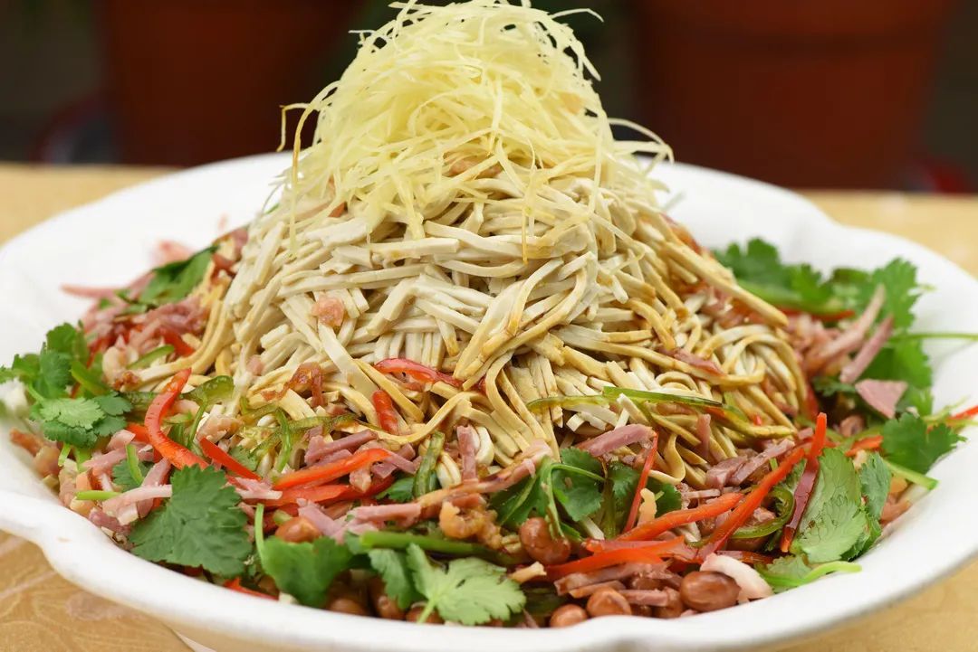 泰州干丝,又称泰州五味干丝,是泰州传统的风味小吃,至今已有200多年的历史。相传,这道早茶,是清代泰州城东门附近一家叫“者者居”的素食馆子里推出来的。由于烫干丝既富有营养,又味美、清淡,所以深受广大顾客的欢迎。
