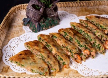 这种烧饼大而且薄,形状很像一只圆盘,因为制作比较简单, 许多家庭妇女都能掌握这门技艺。馅心用苋菜或韭菜配以河虾和肉丁。其做法是先以温水和面,面要和得很软,再将馅包入面中成团状,用掌心轻轻压扁。而后放在平底锅 上烘烤,使之“硬化”,再用油煎,直到全熟。刚出锅的大烧饼,色黄皮脆,遍体冒油,而里面的馅心又分明可见。尤其在深绿色的馅心中,突出几只通红的大虾,极富美感。加 之香味扑鼻,令人馋涎欲滴。