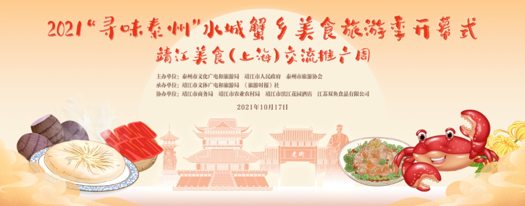 “2021‘寻味泰州’水城蟹乡美食旅游季暨靖江美食(上海)交流推广周”活动将于10月17日下午16:00开始,届时不仅有精彩的表演与现场美食制作,还将有上海电视台资深主持人丁晓军、垂直本地生活达人蔡小花、玩乐探店达人叶小花玩上海、沪语抖音达人姜阿姨、Z世代美食达人山芋等六位“泰州文旅长三角推荐官”亮相,泰州好吃好玩好看好逛的地方统统告诉你!