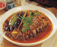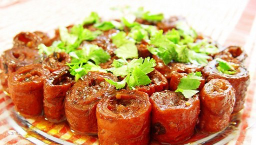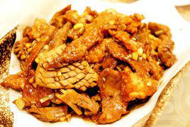 4、老爆三:在天津地区极为流行的一道菜,下饭下酒都非常适宜,原料有羊心,羊肝,羊腰等,特点是色泽红亮,口味咸鲜,蒜香味浓。老爆三在天津地区与鱼香肉丝,宫保鸡丁,木须肉并称为四大家常菜。
