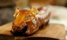 27、烤乳猪:广西的传统佳肴,不过各地的选料、做工和用料不同,所以广西烤乳猪风味也略有不同。乳猪需用糯米或大米喂养,使其肉细皮嫩为上,一般选用未断奶的四公斤左右的乳猪为佳,剖腹后将猪腔撑开,风干后放在炭火上烤,一面烤一面将其两面翻转,同时抹上酱油、蜂蜜等香料加工烤制,使其皮色呈金黄,敲击时声音清脆,此时肉质细软爽口。食用时将其履于盘中,以刀切成小块,拌以黄皮酱、白糖或酸甜酱食之,入口酥脆,难以停筷,食后口有余香,真是一大美食。