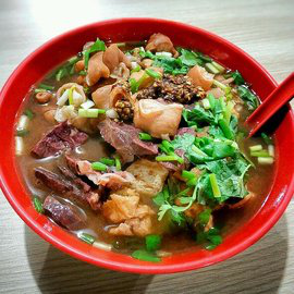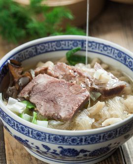 77、淮南牛肉汤:安徽菜沿淮片的代表之一,是苏豫鲁皖沪一带家喻户晓的名小吃。淮南牛肉汤具有鲜醇、清爽、浓香的特色;有咸汤、甜汤之分。咸的牛肉汤肉肥汤鲜,特别是加上葱段后,滋味更鲜。不黑汤,喝多不上火,嗓不干,再配以粉丝和干丝;甜牛肉汤是指没加盐的牛肉汤,或者加少量盐的牛肉汤,其味清爽,滋味醇厚。