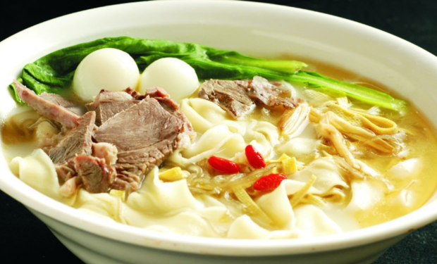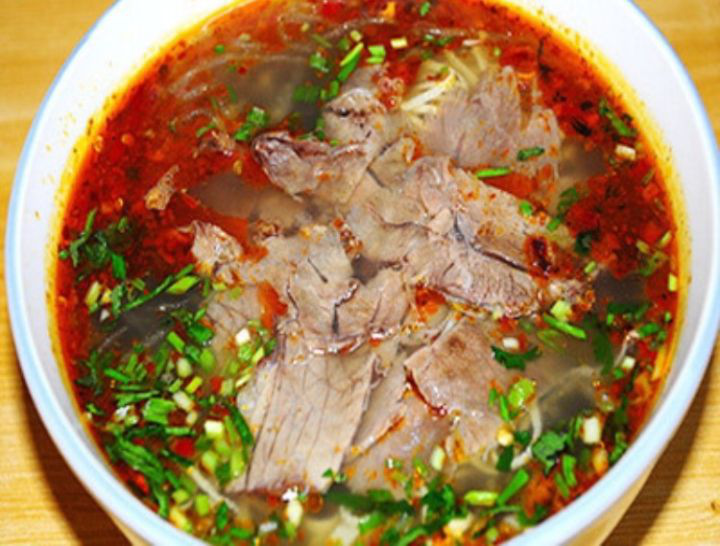 56、兰州清汤牛肉面:兰州清汤牛肉面俗称“牛肉拉面”,是兰州最为著名的风味小吃和最具特色的大众化经济小吃,被当地人誉为兰州的麦当劳。兰州牛肉面创始于光绪年间,系回族老人马保子首创。牛肉面以肉烂汤鲜、面质精细而蜚声中外。兰州牛肉面有一清(汤清)、二白(萝卜白)、三红 (辣子油红)、四绿(香菜绿)、五黄(面条黄亮)五大特点。面条根据粗细可分为大宽、宽、细、二细、毛细、韭叶子等种类。面条用手工现场拉成,一碗面不到两分钟即可做好,再浇上调好的牛肉面汤、白萝卜片,调上红红的辣椒油、碧绿的蒜苗、香菜,食之令人叫绝。