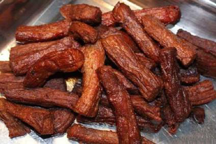 26、风干牛羊肉:风干肉往往是在每年的十二月底做,这时气温都在零度以下。通常将牛、羊肉切成条状,也有的抹上盐和一些野生的佐料,挂在通风、阴凉的地主,让其冰冻风干,既去水分,又保持鲜味。第二年春季即可食用,口感酥脆、味道鲜美。