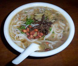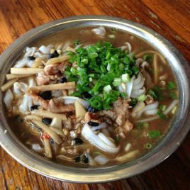 94、过桥米线:云南滇南地区特有的小吃,属滇菜系,起源于蒙自地区,由汤料、佐料、生的猪里脊肉片、鸡脯肉片、乌鱼片及五成熟的猪腰片、肚头片、水发鱿鱼片制作而成。辅料有来过的豌豆尖、韭菜,以及芫荽、葱丝、草芽丝、姜丝、玉兰片、氽过的豆腐皮;四是主食,即用水略烫过的米线。鹅油封面,汤汁滚烫,但不冒热气。