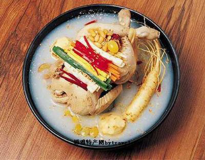 41、御土荷叶鸡:原名叫花鸡,选用承德离宫的黄土,热河泉水和湖内的荷叶,故名御土荷叶鸡。吃时用刀,叉割成小块,蘸着调味品吃,味道鲜嫩爽,渗着荷叶清香,别具风味。