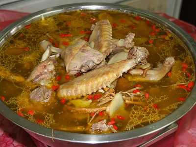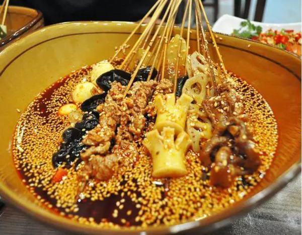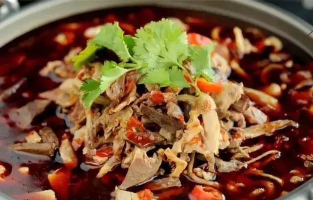 62、钵钵鸡:以陶器钵盛放配以麻辣为主的佐料,加上多种调料的去骨鸡片拌和而成。有皮脆肉嫩,麻辣鲜香,甜咸适中的特色。吃奶汤面时配以钵钵鸡,别具风格。