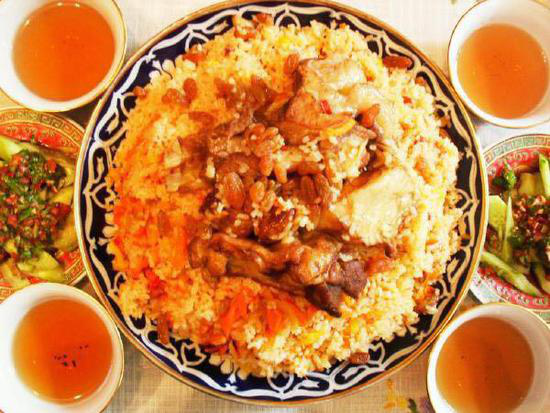 20、抓饭:维吾尔语称"波劳",是新疆维吾尔、乌孜别克等民族人民喜爱的一种饭食,多净手掇食,故汉语称为"抓饭"。抓饭营养丰富,具有食补的功效,是维吾尔民族过节、待客的必备食品之一。因为最初是用手抓食的,故得此名。