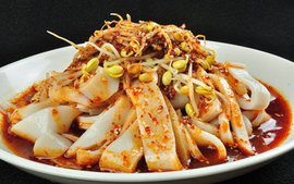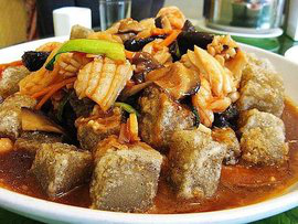 38、大连——海鲜焖子:焖子几乎已经成为了大连人的一个情结。它的原料是淀粉,用特殊的方法制成固体的小块,呈半透明状,把这些小块在平底煎锅里煎熟,稍微有点焦,然后淋上酱油、醋、麻油、香油、芝麻酱等调料, 再撒上葱末、蒜末等调味品,一碗热腾腾,香喷喷的“焖子”就做好了。如今,焖子已经渐渐地登堂入室,在一些大酒店可以吃到海鲜焖子或海参焖子等,颇具地方风味。