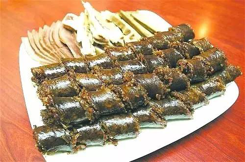 17、蒙古血肠:血肠制作的主要原料是羊小肠和羊血。羊血是通过蒙古掏心法杀羊后的产物,将盐、葱末、少量的水和面粉放入羊血中,调成血浆。再将羊肠用盐水洗净,灌入调好佐料的羊血,细线扎紧羊肠两头于水中煮熟。煮制过程中需用细针扎小孔给羊肠放气,以免羊肠中的热气顶破羊肠。对一次未食用完的羊肠,可以在煮过手把肉的肉汤中再次烹煮加热食用,此法集加热与加味的双重功效,若无肉汤,用蒸锅加热亦可,或经煎烤、风味更佳。