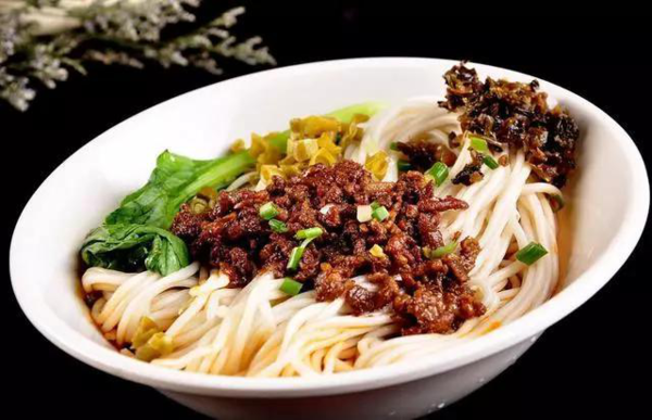 59、担担面:此为著名的成都小吃。用面粉擀制成面条,煮熟,舀上炒制的猪肉末而成。成菜面条细薄,卤汁酥香,咸鲜微辣,香气扑鼻,十分入味。
