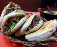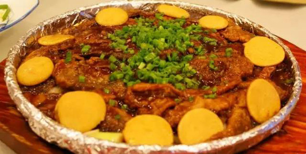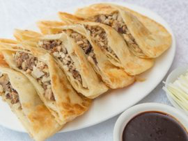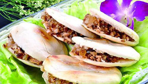 35、熏肉大饼:熏肉大饼是吉林省四平市著名的特色传统风味小吃之一,1908年由河北滦县柳庄人李广忠(乳名连贵)在梨树县始创。熏肉用10余种中药煮肉,大饼用煮肉的汤油加面粉、加调料调成软酥,抹在饼内起层,便于夹肉而食。再配以葱丝、面酱、大米绿豆粥、枣水同食,更是别有风味。