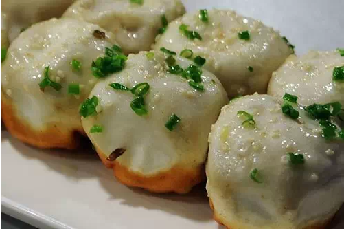 9、鸡肉生煎馒头:这是上海的特色风味小吃。这种小吃是以发酵后的精白面粉作皮,用熟鸡脯肉丁、猪夹心肉末和肉皮冻加香油等多种调料做成馅心。包捏好的馒头尖上还要蘸上葱花和芝麻,表层刷上素油,放入油锅中煎熟。该品形态饱满,上半部有黄澄澄的芝麻和碧绿的葱花,松软适口。下半部则酥脆可口,馅重汁多,越吃越香。