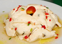 85、白切鸡:广州菜中最广传的一种菜,不加配料且保持原味是最大的特色!白切鸡色洁白带油黄,皮爽肉滑,具有葱油香味,葱段打花镶边,清淡鲜美。