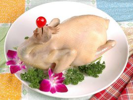 57、百花全鸡:这也是用发菜作配料的名菜。用一只肥母鸡,取下鸡脯,鸡里脊,加脂肉剁成细泥,加水、蛋清、精盐,搅成鸡茸。剩下部分加葱、姜、精盐上笼蒸烂取出,留头、爪、翅膀,将其余的肉切成五分大的片铺在鱼盘中。另将菠菜、发菜、蒸熟的蛋黄分别制成细末。这时,将鸡茸抹在盘内铺的鸡片上做成菱形块(也可做成其它图案)将菠菜、发菜、蛋黄这四种碎末整齐地撒在鸡茸上。将鸡头用刀劈开摆在鱼盘前端,鸡爪去尖按鸡形摆在鱼盘的另一端,翅膀摆在两边。上笼蒸十分钟,勾流水芡即成。这道菜操作精细,图案新颖,香嫩可口,清淡不腻。
