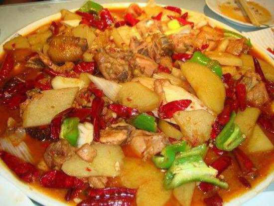 19、大盘鸡:新疆大盘鸡是新疆地区名菜,主要用料为鸡块和土豆块,配皮带面烹饪而成。菜品色彩鲜艳,有爽滑麻辣的鸡肉和软糯甜润的土豆,辣中有香,粗中带细,而且经济实惠,亲朋聚会食用尚佳。