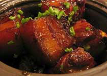 46、把子肉:把子肉是中华名小吃之一,是华东地区极具特色的小吃。根据传统鲁菜食谱所述,早在清朝时期,鲁地即流传有用草绳捆扎五花肉,加以酱油炖煮而成的把子肉,其味入口即化,香而不腻。