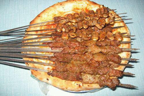18、烤羊肉串:烤羊肉串在新疆是最有名的民族风味小吃。制作原料主要有羊肉、洋葱、盐等。把羊肉与洋葱拌匀腌渍一段时间可减少膻味。