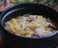 34、酸菜猪肉炖粉条:将五花肉切片煸出油,与酸菜一同爆炒,加水炖煮成汤后,放入红薯粉丝煮软,即为酸菜猪肉炖粉条。