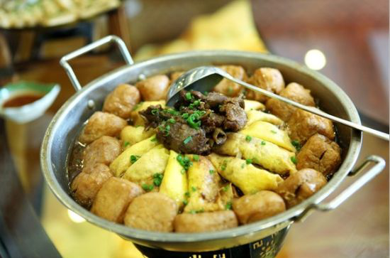 78、一品锅:“一品锅”是黄山人冬季常吃的一种火锅。用一只两耳大铁锅,将备好的材料分铺成若干层,最底层是萝卜丝、干角豆、笋衣、冬瓜、冬笋等,底层配料称为“垫锅”,“垫锅”之上,依次是肉、豆腐包、鸭子夹、肉圆、鸡块、野味等。已仲裁一个花样称为“一层楼”,楼数越多、层次越高越好。每层一次铺好后必须猛火烧,使全国滚沸几分钟,再用温火慢炖三四小时,并不时用勺将原汤从上而下浇入,以渗透其味。一品锅烧制得好,油而不腻、烂而不化、热而不烫、冷而不却,保持了色香味的完美结合。
