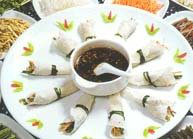 91、丝娃娃:别名素春卷,在贵阳是一种常见的地方传统小吃之一,只要在贵阳各地每一处街上,几乎都能看得见。而此菜素菜脆嫩,酸辣爽口,开胃健脾。猛一看颇似产房里初生的婴儿被裹在"襁褓"中。"襁褓"是用大米面粉烙成的薄饼,薄薄如纸却有一只手掌那么大。再卷入萝卜丝、折耳根(鱼香菜)、海带丝、炸黄豆、脆哨、糊辣椒等。又名素春卷。当地人吃时,少不了注入酸酸辣辣的汁液。这蘸水就是丝娃娃的精髓。